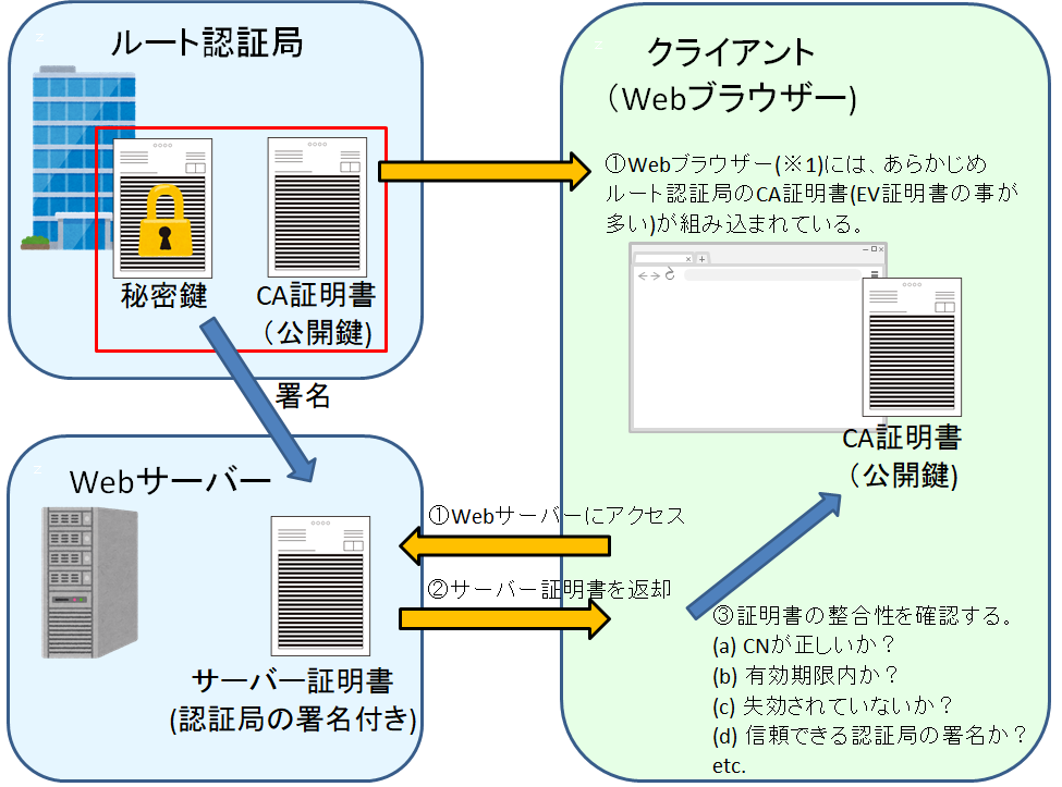 Webブラウザは、Webサーバーに接続する際、次の手順で証明書の整合性を確認します。