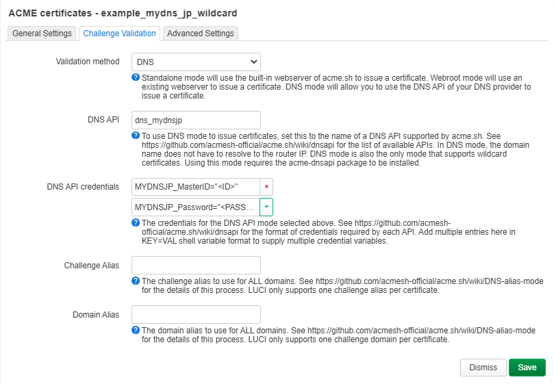 validation method: ワイルドカードの証明書を利用する場合は DNS を指定 DNS API : dns_mydnsjp DNS API credentials : MYDNSJP_MasterID="<ID>" MYDNSJP_Password="<PASSWORD>"