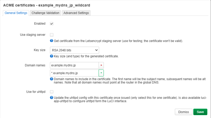 Enabled : 有効にする場合☑する Use staging server : Key size : Domain names : <ドメイン名> User for uhttpd : uhttpd に証明書を適用する場合☑する